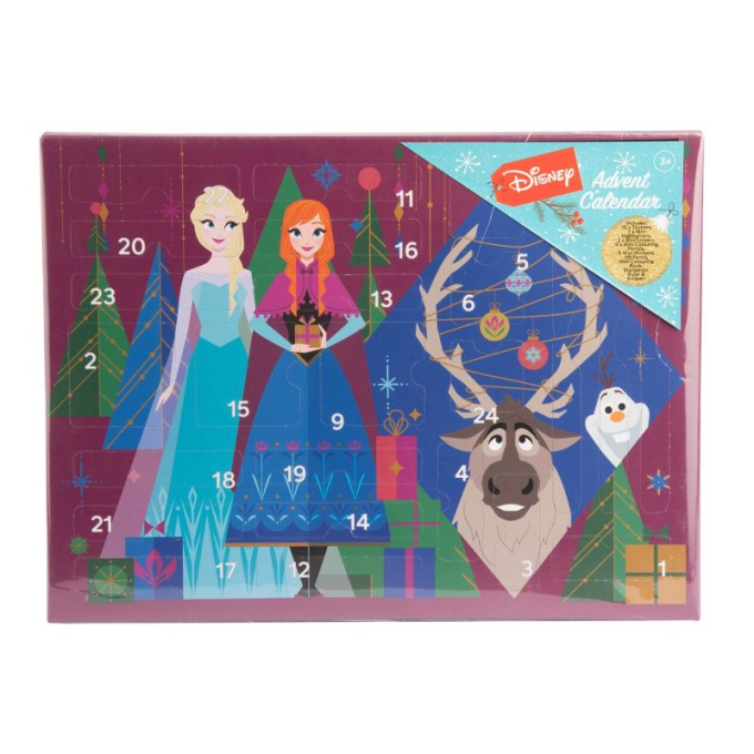Вълшебен коледен адвент календар Frozen с 24 подаръка изненада, аксесоари, мини играчки и декоративни елементи от света на Замръзналото кралство. Размери: 27 x 38 x 4 см.