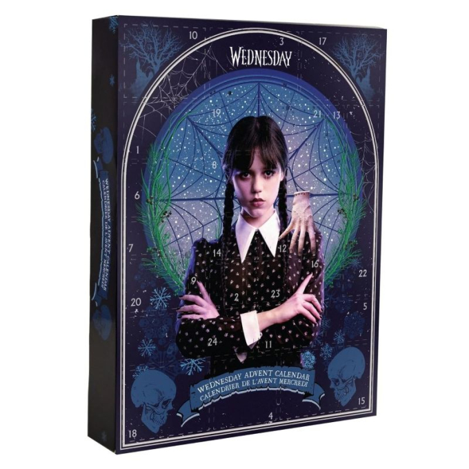 Официално лицензиран, вълшебен адвент календар Wednesday с 24 подаръчни изненади. (чорапи, торбичка с връзки, маркер, гумен ключодържател, детски печат, линийка, химикалка, гумичка и още много други изненади). Размери: 33 x 24.5 x 5 см.