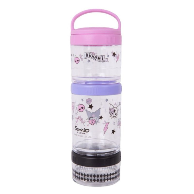 Страхотна кутия за храна Kuromi с три отделни отделения и удобна дръжка за носене в ръка. Размери: 5,8 x 5,8 x 20 см. Kaпацитети: 10 мл, 60 мл, 150 мл (общо 310 мл). Не е подходящо за съдомиялна машина Не използвайте в микровълнова фурна.