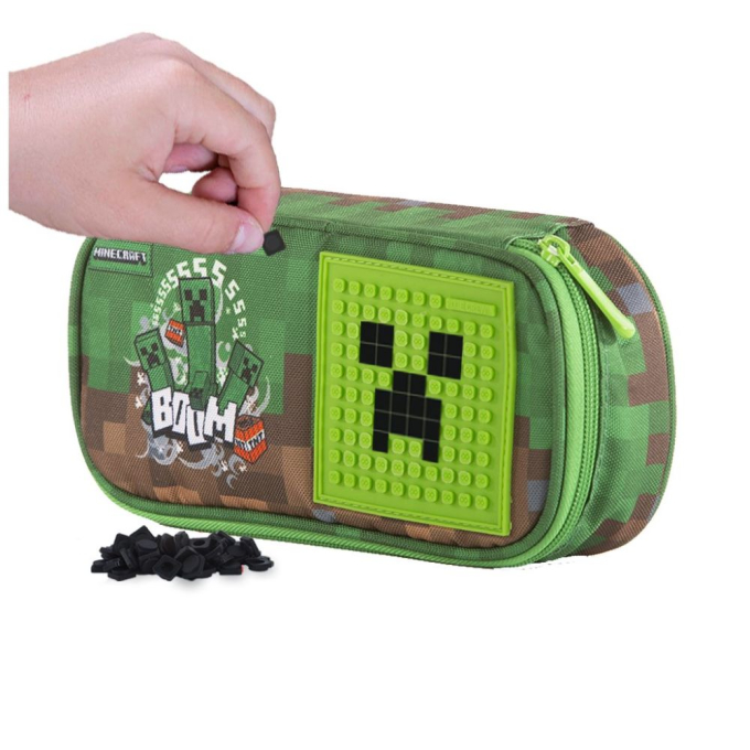 Висококачествен принт на ssSSSSSss BOOM, MINECRAFT на преден панел върху основа от зелени и кафяви блокчета. Здрава, промазана, материя за лесно почистване. Класически зелен силиконов панел Pixie Crew 8х8 см с пинчета за подреждане и кликване на пиксели. 50 черни силиконови пиксела в комллекта. Здрав цип със зелен метален накрайник. Пришит MINECRAFT текстилен етикет.