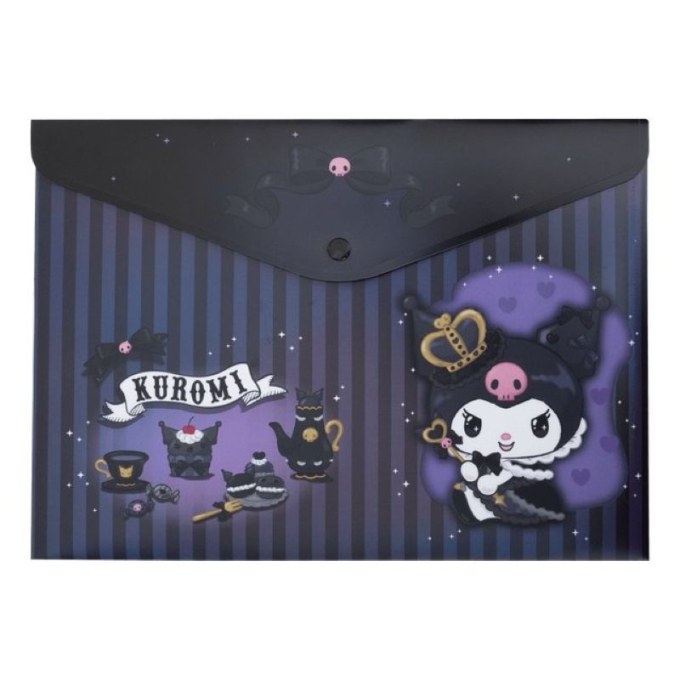 Чаровна PVC папка Kuromi, направена от здрави и надеждни материали. Размер А4. Затваряне с копче. Подходяща за пренасяне и съхраняване на документи и материали.