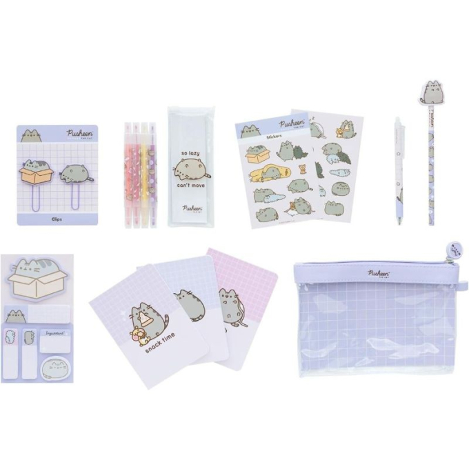 Ученически комплект Pusheen. Химикалка и молив 3 тетрадки A6. 4 двувърхи текстмаркера. 2 щипки за хартия. Стикери и самозалепващи се листчета. Опакован в прозрачен PVC несесер. Размер на несесера: 23 x 15.5 cm.