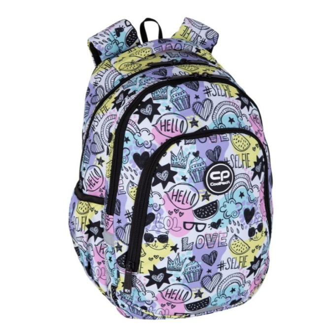Компактна раница с две основни отделения. Особено подходяща за 1-4 клас. Удобен, твърд EVA гръб. Колан за закопчаване през гърдите. Подсилено дъно. Странични джобове. Водоотблъскваща материя. Подплатени презрамки и дръжка за носене в ръка. Органайзер за дребни вещи в предния джоб. Отделение за лаптоп. Ключодържател. Размери: 41 х 31 х 15 см.