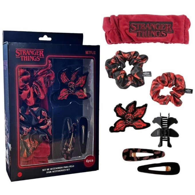 Комплект аксесоари за коса, вдъхновен от сериала Stranger Things. Съдържание на комплекта: 2 фиби, 2 ластика тип скрънчи, 1 щипка за коса, 1 лента за коса. Подходящ за ежедневна употреба и тематични визии. Чудесен избор за подарък и колекционери. Официално лицензиран продукт.