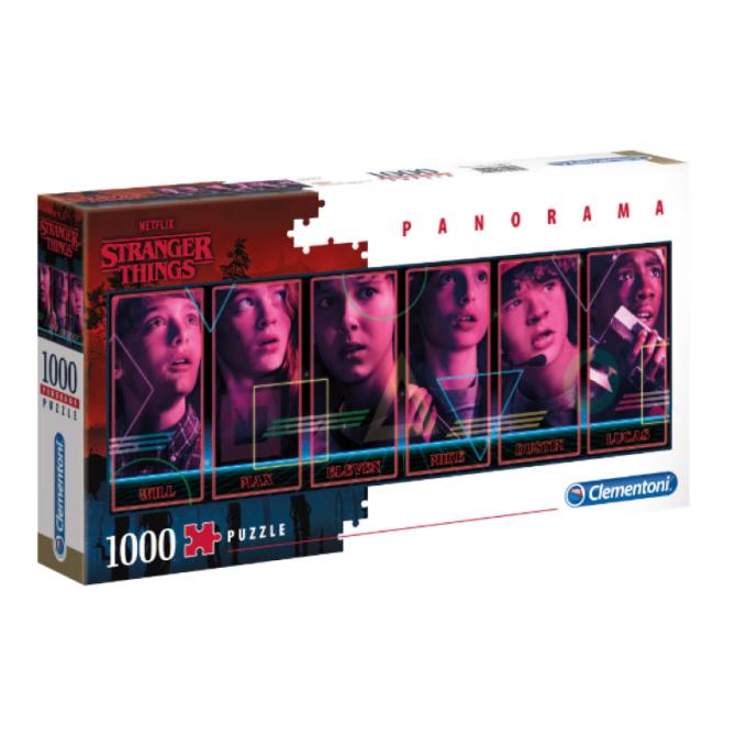 1000 части. Stranger Things дизайн. Размери на кутията: 33 x 17.5 x 6 cm. Подходящ за фенове на сериала и любители на предизвикателни пъзели.